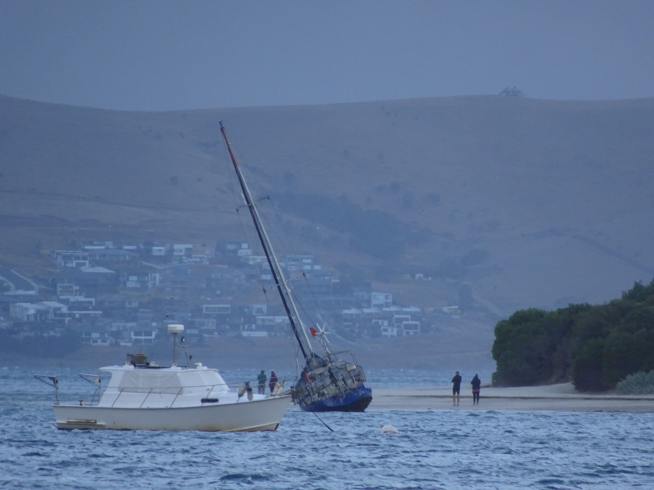 We gaan nog maar even slapen als het morgen licht wordt moeten we de boel verder bekijken. Als we ’s morgens wakker worden zien we het schip scheef op het strand liggen. We denken hoe achterhalen we de eigenaar we zien er wel mensen omheen lopen. Trijnie en ik gaan met de bijboot naar de wal om de eigenaar op te sporen. Het waait nog hard en er staan behoorlijke golven we doen het buitenboord motortje achter het bootje en scheuren door de golven, nou ja scheuren, zo hard gaat het niet we landen netjes op het strand en lopen naar de boot die ons aangevaren heeft.
