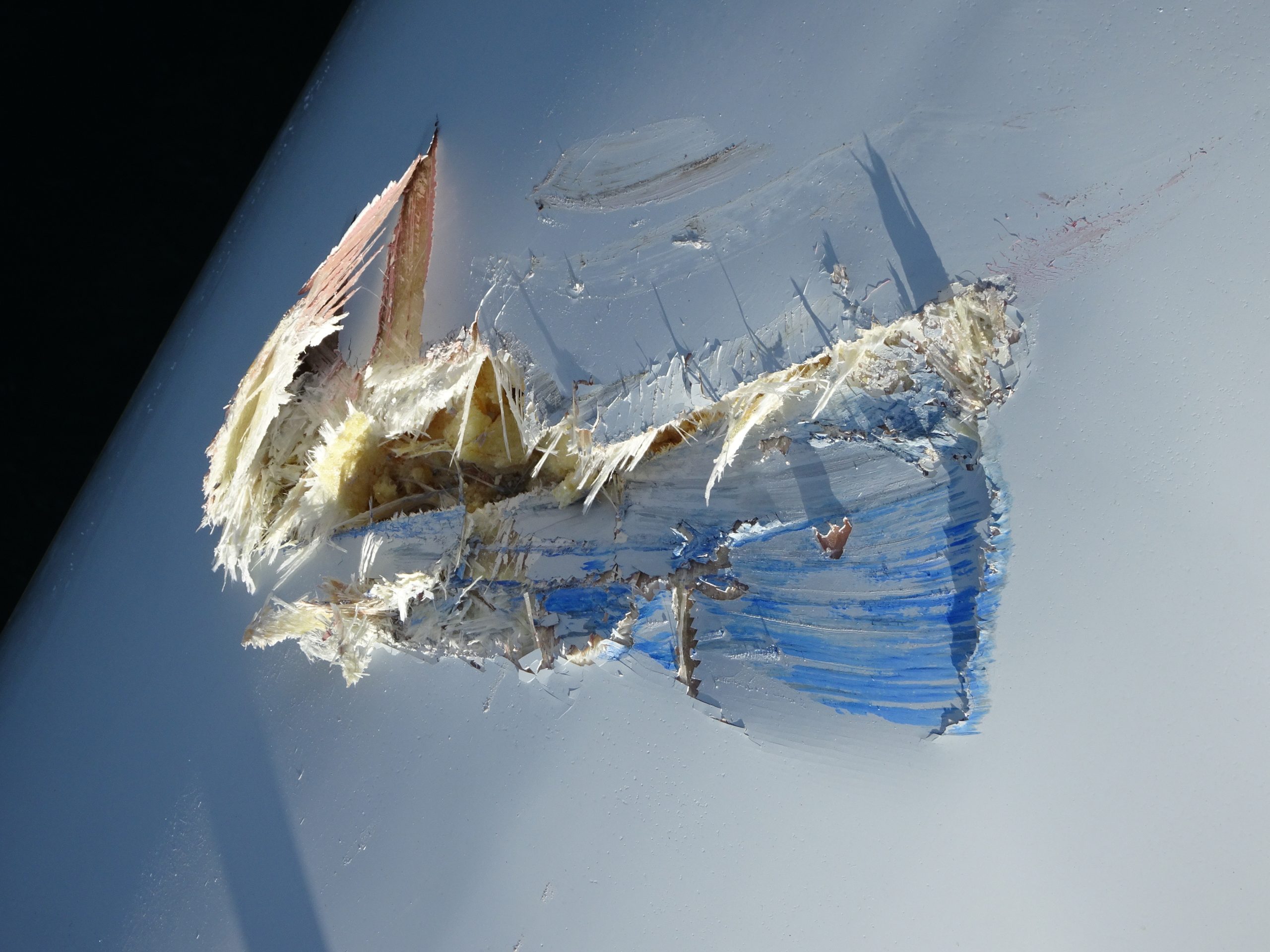 De zondag is nog maar net begonnen als de storm vijftig knp. aantikt. Ik lig een beetje in bed te draaien als er ineens een klap tegen de boot aan komt ik hoor gekraak en nog een klap! Wat gebeurt er? We stuiven naar buiten, zijn we van anker af?!! Maar nee wij liggen nog, maar een stalen twaalf meter jacht is van zijn mooring afgeslagen, de lijn is gebroken en hij boort met de neus bij ons binnen op twee plekken. Inmiddels drijft hij verder we kunnen hem niet meer zien het is harstikke donker. We bekijken de schade en schrikken van de ravage. Inmiddels zakt de wind wat af en gaat draaien zoals voorspeld. Het wordt wat rustiger. Trijnie belt nog met kustwacht met politie om te melden at we aangevaren zijn. We plakken de beschadigingen nog af met plastic zodat er geen regen in de beschadigingen kan komen anders komt het water tussen de binnen en buiten schaal en dat wil je niet.