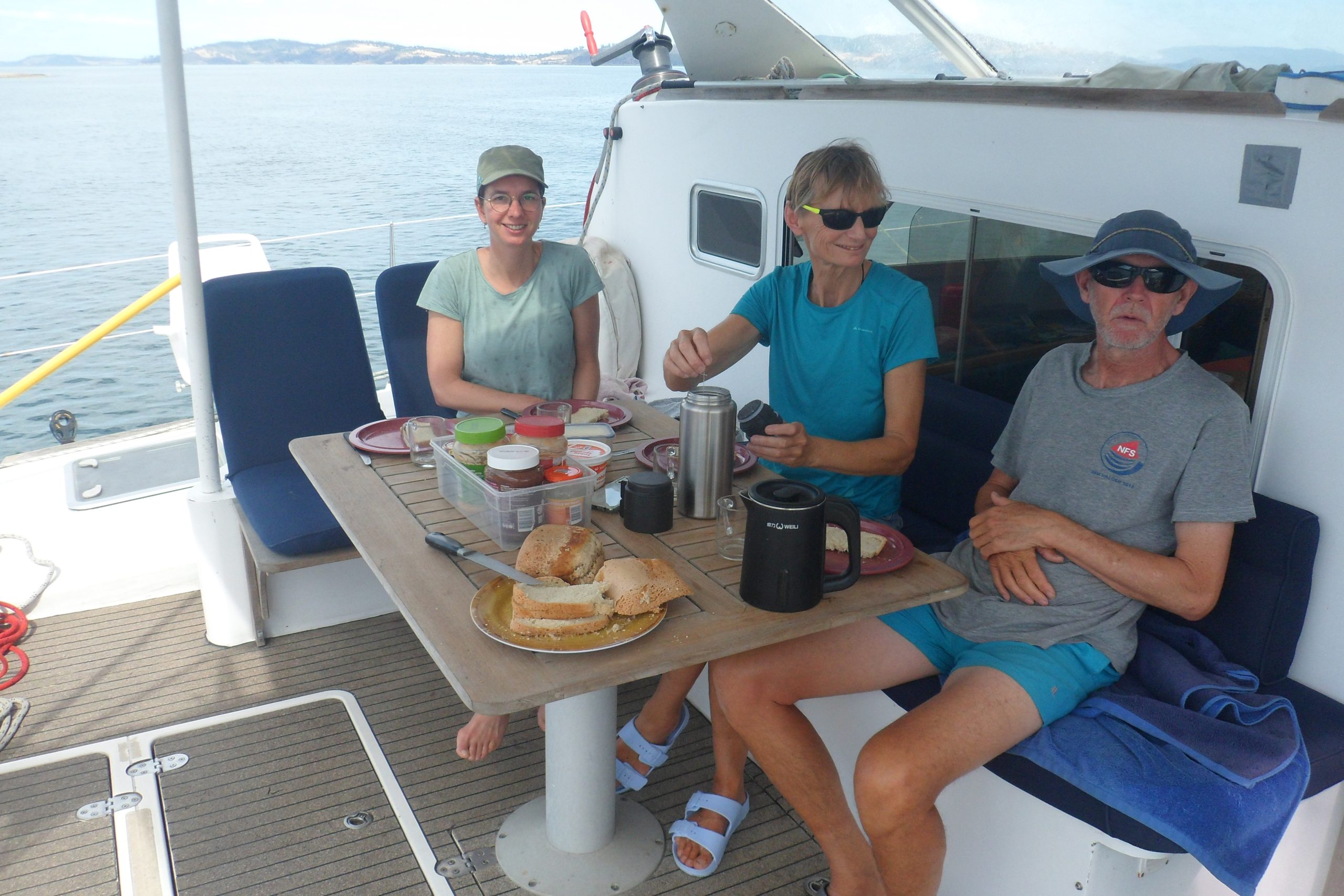 En zo strijken de dagen voorbij een stuk zeilen een wandeling maken ’s avonds spelletjes doen we vervelen ons niet. Ook bakken we elke dag vers brood aan boord met een broodbak machine en om de andere dag een krenten brood het leven is zo slecht nog niet, niks geen muffe scheepsbeschuit en elke avond een gevarieerd diner. De scheepsjongens van Bonte Koe zouden er jaloers op zijn.